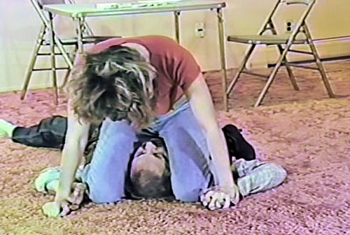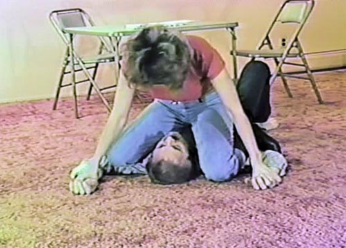 Scene 3 continues with the same pin but now the camera has moved into a very tight closeup and se see Treena’s dynamite legs in her tight jeans and we can see clearly now her turn-on face as she grinds her kness into his arms and her gorgeous rear onto his chest for now Jud is in trouble as he cannot breathe as she bounces up and down on his chest ignoring his pleas.