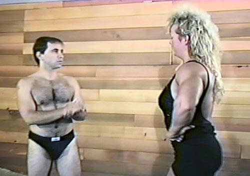 Out to avenge her sister’s rejection by the little sleazeball the Amazon warrior lifts, carries, spins and