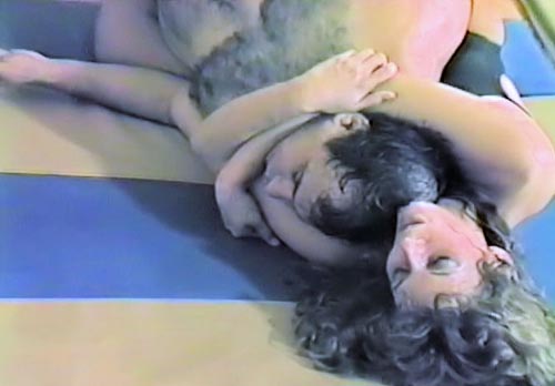 Spirited, intense wrestling action and Jim does all he can to thwart his turn-on female challenger.