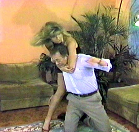 She pulls his hair, slaps him, applies a chokehold, and then a head scissors and shows him who is boss.