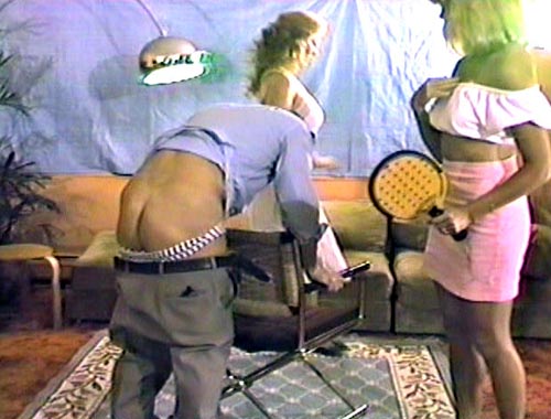 Not through yet, momma and Tracy decide Charles needs lots of discipline and after pulling his pants down, produces a paddle ball racquet and does she ever paddle him fiercely and strongly, leaving a red and raw ass.