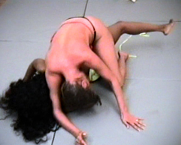fighting action. A fierce battle is under way, as each holds her own; but after several dynamic scissors submissions, a winner