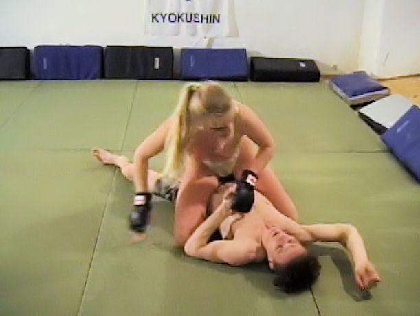 She is mean and holds nothing back as she uses headlocks, choke holds, arm bars, body scissors, and belly punching to hurt her male rival.